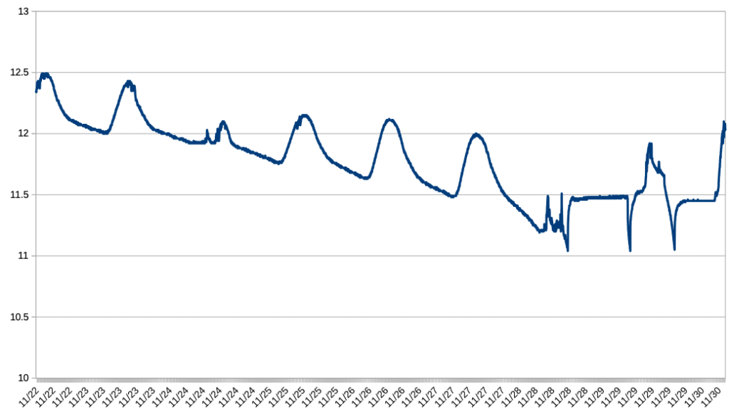 It appears that everything remained powered up until the ugly bit of charting near the end. The small charging peak on 11/24 corresponds to a rainy cloudy day with a little bit of sun in the afternoon. The really flat part near the end shows both a couple more cloudy rainy days and the weirdness that a fairly deeply discharged battery can display.