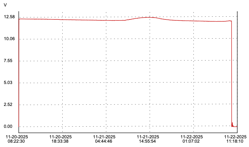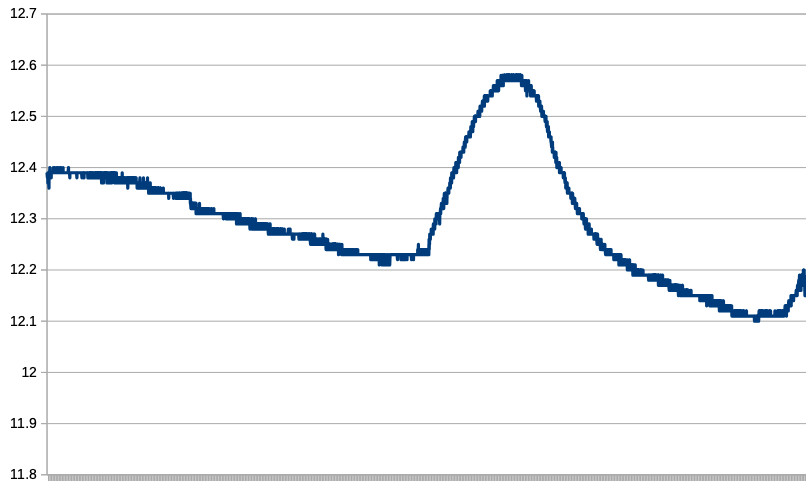 The chart provided by the logger’s own software is scaled to include the zero volts from the first few samples before and after I connected it to the battery. By making my own chart with the CSV data, I can scale it to exaggerate the two points that was was able to glean from this slightly more than 48 hours worth of data.