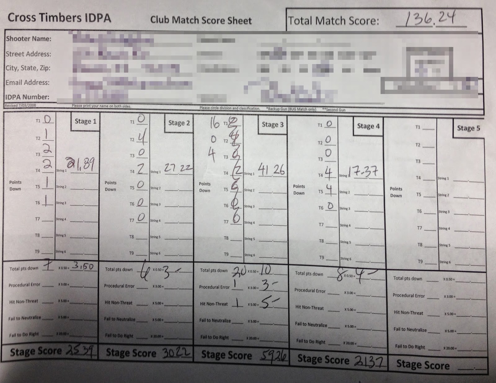 In this dance, my ammo jammed up on the first shot of the second target. I (eventually) cleared the jam and kept count, placing two more shots on the proper target. Moved to P2, did that, moved back to P1 and somehow only placed three shots, skipping the last target. Consequently, that cost me 3 misses and a procedural error for not fully engaging a target with the required number of rounds. I also managed to hit the Non-Threat on the left target. Twice. It was just the edge of the Non-Threat, not that it matters 🙂