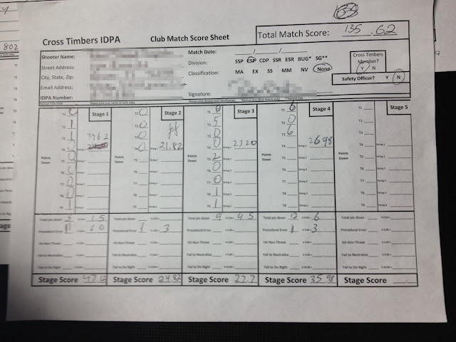 Because we ran late at the range, the score sheets were not all processed on site. Consequently, I did not know my total score until today when the official scores were posted to the forum.