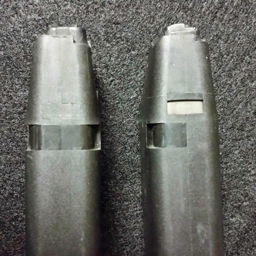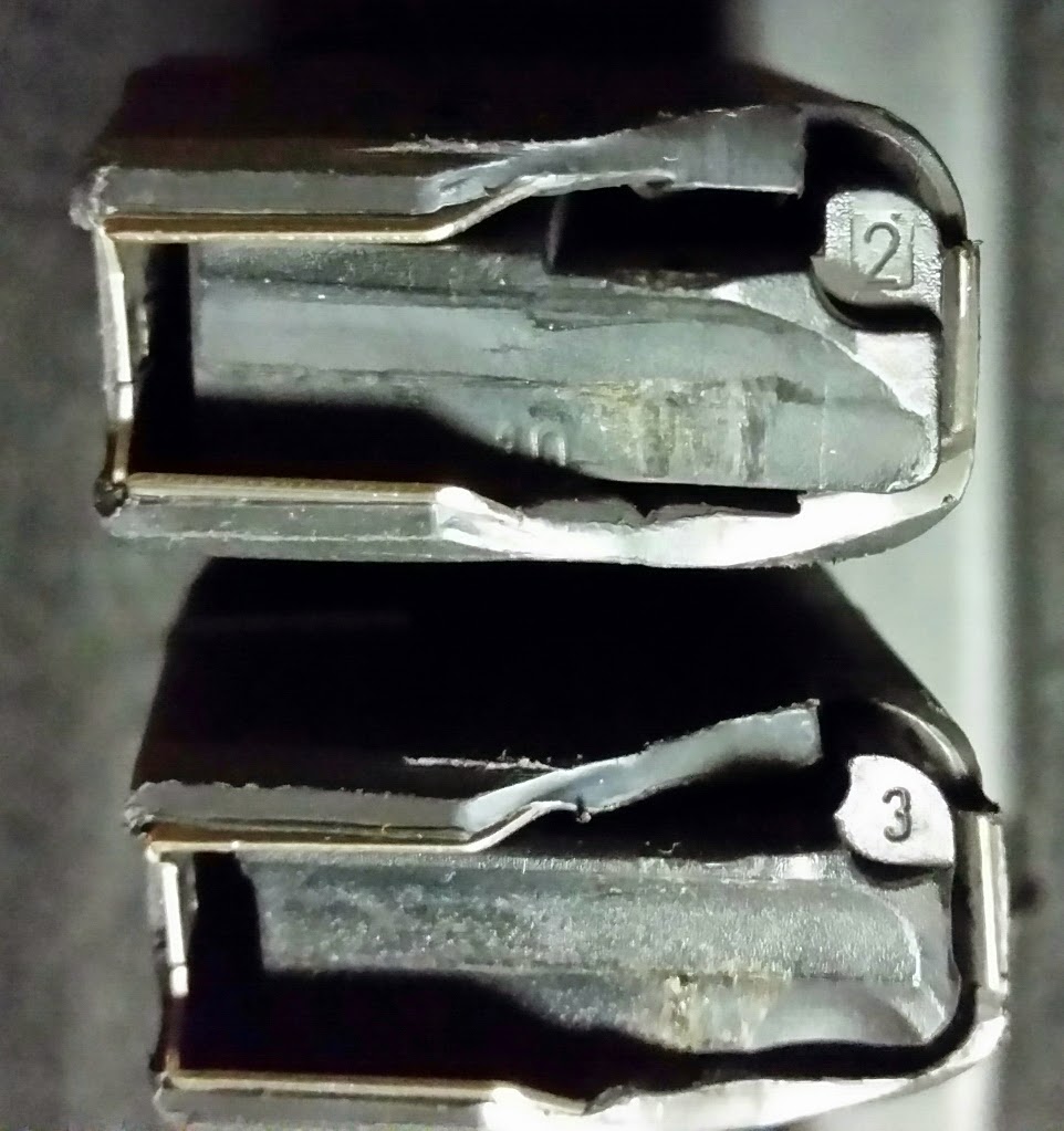 In a previous post, I noted that I had a magazine that did not easily drop clear at reload time. Since I had numbered the magazines, I knew which one it was. While I was preparing the magazines, I had them all in one place and wanted to compare this troublemaker with it’s stablemates. I found a couple of differences that I am sure are documented online somewhere else, but here goes….