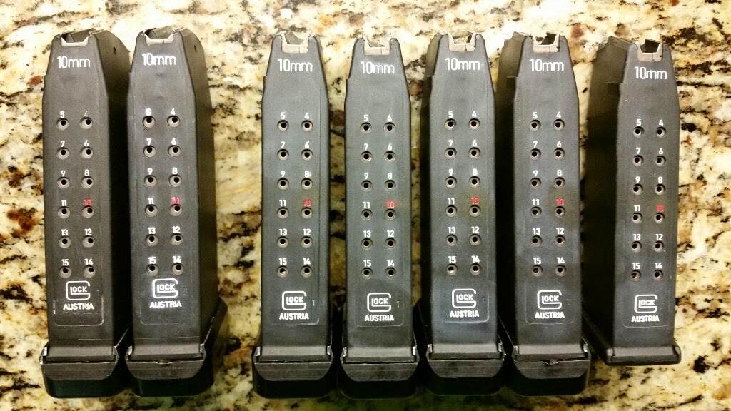 Referring back to the pic above of all the magazines, note that the two on the left are slightly different in the placement of the Glock logo. Yes, I have two magazines of this different model. In the original numbering order, these were magazines 0 and 2. The first was easy to remove from the magazine order. I did all other shooting with magazines 1, 2 and 3. However, I have so rarely had to drop mag #2 on the clock that I haven’t noticed if it also had trouble dropping clear.
