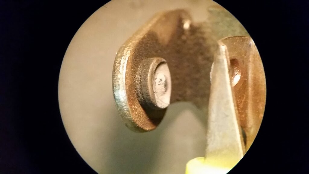 Hmmm. It runs almost exactly the same, no power from cylinder 4 and that pipe is barely warm. It runs just was well with our without a plug wire on 4. I connect a spark plug to the #4 wire and there *is* a spark, though admittedly, it looks a little weak. I dug deeper and found that the contact on the points was far beyond merely worn. They were eroded almost away, essentially missing.