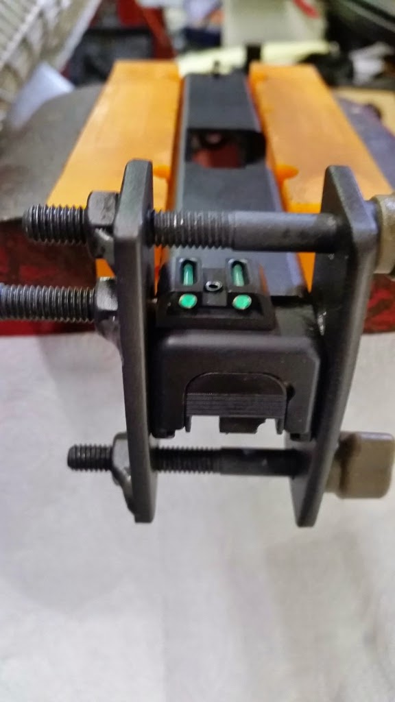 Installing the new sight was pretty much exactly the reverse of removing the old. I had to tap the new sight far enough into the dovetail for the RST pusher plate to be able to clamp to the slide, then the pusher very easily and precisely moved it into place.